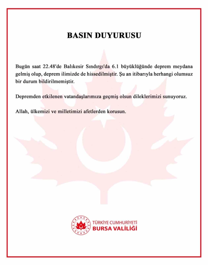 Bursa Valiliği depremden olumsuz etkilenen vatandaşların olmadığını belirtilerek, "Bugün saat 22.48’de Balıkesir Sındırgı’da 6.1 büyüklüğünde deprem meydana gelmiş olup, deprem ilimizde de hissedilmiştir. Şu an itibarıyla herhangi bir olumsuz durum bildirilmemiştir. Depremden etkilenen vatandaşlarımıza geçmiş olsun dileklerimizi sunuyoruz. Allah ülkemizi ve milletimizi afetlerden korusun" açıklamasında bulundu.