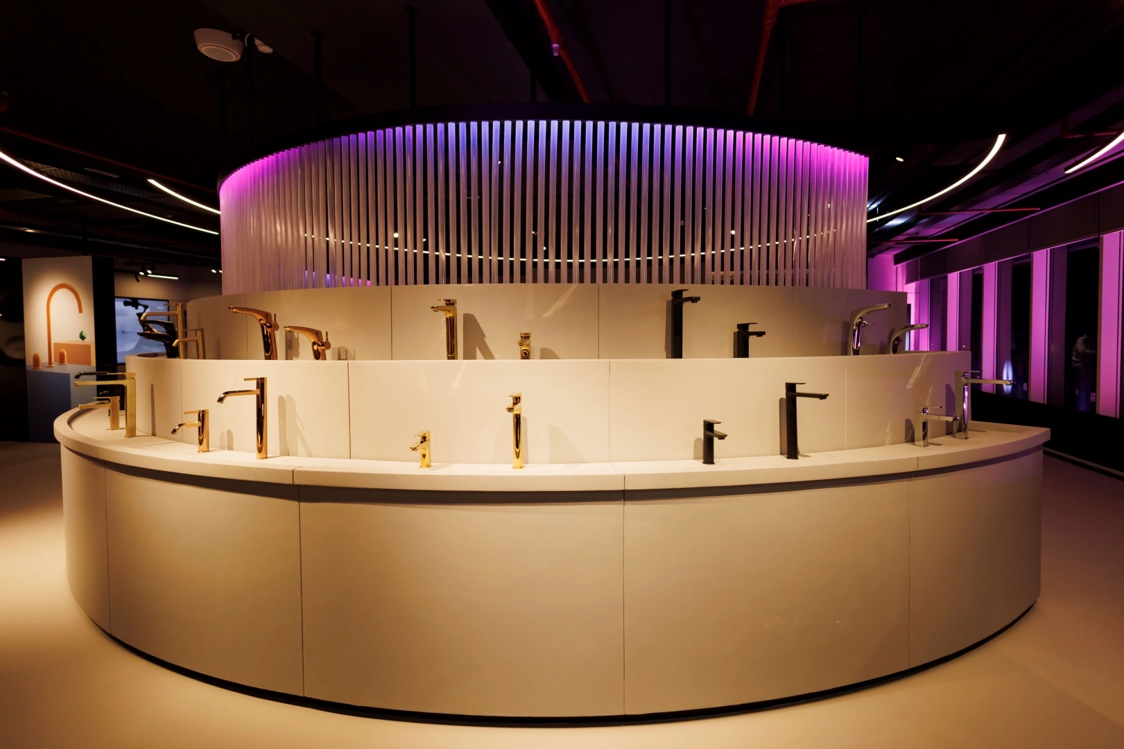 Yapının bir diğer katı ise ana galeriyi tamamlayan ve kendine özgü bir atmosfere sahip olan Roca Grup’un bir diğer markası LAUFEN Delhi alanına ayrıldı. Daha koyu ve içe dönük bir renk paletiyle kurgulanan bu bölüm, LAUFEN’in premium koleksiyonlarının heykelsi niteliklerini ve tasarımdaki inceliğini güçlü bir biçimde öne çıkarıyor. Ortaya çıkan bütüncül deneyim, her iki markanın ayrı kimliklerini net bir şekilde yansıtırken, tasarım mükemmeliyetine yönelik ortak yaklaşımlarını da pekiştirerek uyumlu ve dengeli bir mekansal anlatı sunuyor.