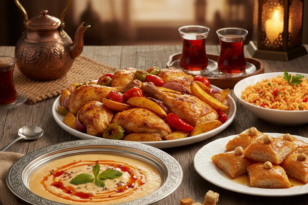 İşte 4 kişilik, pratik ve lezzetli bir iftar menüsü. Bu menüde domates çorbasından fırında sebzeli tavuğa kadar sofrayı zenginleştirecek tatlar bir araya geliyor. İftar Menüsü Hurma ve zeytin Domates çorbası Fırında sebzeli tavuk Bulgur pilavı Yoğurtlu semizotu salatası Kadayıf tatlısı Domates Çorbası Malzemeler 4 adet orta boy domates 1 yemek kaşığı tereyağı 1 yemek kaşığı un 4 su bardağı su veya tavuk suyu 1 çay bardağı süt Tuz Karabiber Yapılışı Tereyağı tencerede eritilir ve üzerine un eklenerek hafifçe kavrulur. Rendelenmiş domatesler eklenir ve birkaç dakika pişirilir. Ardından su veya tavuk suyu ilave edilerek karıştırılır. Çorba kaynamaya başladıktan sonra tuz ve karabiber eklenir. Son olarak süt ilave edilip birkaç dakika daha kaynatılır ve sıcak servis edilir. Fırında Sebzeli Tavuk Malzemeler 4 adet tavuk but veya baget 3 adet patates 2 adet havuç 1 adet kabak 1 adet soğan 3 yemek kaşığı zeytinyağı 1 yemek kaşığı salça 1 çay kaşığı kekik 1 çay kaşığı kırmızı toz biber Tuz Yapılışı Patates, havuç, kabak ve soğan iri parçalar halinde doğranır ve fırın tepsisine alınır. Tavuk parçaları sebzelerin üzerine yerleştirilir. Bir kapta zeytinyağı, salça ve baharatlar karıştırılır ve tavukların üzerine sürülür. Önceden ısıtılmış 200 derece fırında yaklaşık 40–45 dakika pişirilir. Bulgur Pilavı Malzemeler 2 su bardağı pilavlık bulgur 1 adet soğan 1 yemek kaşığı tereyağı 1 yemek kaşığı domates salçası 3 su bardağı sıcak su Tuz Yapılışı Soğan küçük küçük doğranır ve tereyağında kavrulur. Salça eklenip kısa süre daha kavrulur. Üzerine bulgur ilave edilerek karıştırılır. Sıcak su ve tuz eklenir. Kısık ateşte bulgur suyunu çekene kadar pişirilir ve dinlendirilerek servis edilir. Yoğurtlu Semizotu Salatası Malzemeler 1 demet semizotu 1 su bardağı yoğurt 1 diş sarımsak Tuz 1 yemek kaşığı zeytinyağı Yapılışı Semizotları iyice yıkanıp doğranır. Yoğurt, ezilmiş sarımsak ve tuz karıştırılır. Semizotları yoğurtla harmanlanır ve üzerine zeytinyağı gezdirilerek servis edilir. Kadayıf Tatlısı Malzemeler 300 gram tel kadayıf 100 gram tereyağı 1 su bardağı dövülmüş ceviz Şerbeti için 2 su bardağı şeker 2 su bardağı su Birkaç damla limon suyu Yapılışı Öncelikle şerbet hazırlanır. Şeker ve su kaynatılır, birkaç damla limon eklenip soğumaya bırakılır. Kadayıf elle didiklenir ve eritilmiş tereyağı ile karıştırılır. Yarısı tepsiye yayılır, üzerine ceviz serpilir ve kalan kadayıf eklenir. 180 derece fırında kızarana kadar pişirilir. Fırından çıkan sıcak tatlının üzerine soğuk şerbet dökülerek dinlendirilir. Bu menü, hem doyurucu hem de dengeli bir iftar sofrası hazırlamak isteyenler için pratik bir seçenek sunuyor. Özellikle sebzelerle zenginleştirilen fırında tavuk ve yanında bulgur pilavı, gün boyu süren orucun ardından vücudu yormadan enerji sağlayacak bir ana yemek alternatifi oluşturuyor.