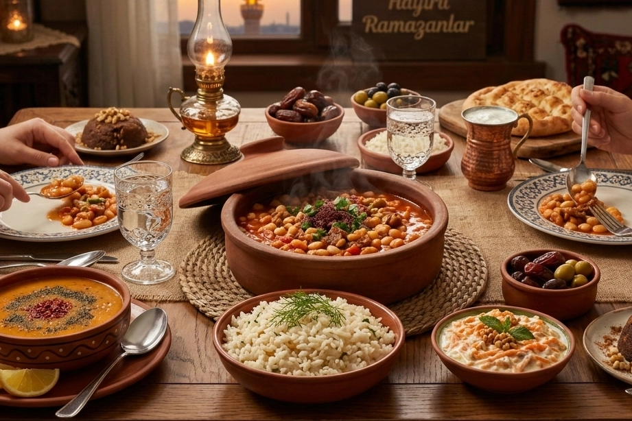 Geleneksel İftar Sofrası: 4 Kişilik Ev Menüsüyle Bereket Aynı Masada Ramazan ayının huzuru, akşam ezanıyla birlikte kurulan sofralarda kendini hissettiriyor. Evde kolayca hazırlanabilen, besleyici ve klasik lezzetlerden oluşan bu 4 kişilik iftar menüsü; çorbasından tatlısına kadar dengeli yapısıyla dikkat çekiyor. İşte mutfaklarda en çok tercih edilen lezzetlerden oluşan iftar menüsü ve tarifleri… İftara Şifa ile Başlangıç: Ezogelin Çorbası Ramazan sofralarının vazgeçilmezi ezogelin çorbası, hafifliğiyle mideyi yormadan iftara başlangıç sağlıyor. Malzemeler: 1 çay bardağı kırmızı mercimek, 1 yemek kaşığı pirinç, 2 yemek kaşığı bulgur, 1 küçük soğan, 1 yemek kaşığı domates salçası, 2 yemek kaşığı sıvı yağ, 1 çay kaşığı nane, karabiber, tuz, 6 su bardağı su. Hazırlanışı: Doğranmış soğan yağda kavrulur, salça eklenir. Yıkanmış mercimek, pirinç ve bulgur ilave edilerek suyu eklenir. Yumuşayana kadar pişirilen çorba, baharatlarla tatlandırılır. Sofranın Ana Lezzeti: Etli Kuru Fasulye Doyurucu ve besleyici özelliğiyle etli kuru fasulye, iftar sofralarının baş tacı olmaya devam ediyor. Malzemeler: 2 su bardağı kuru fasulye, 250 gram kuşbaşı dana eti, 1 orta boy soğan, 3 yemek kaşığı sıvı yağ, 1 yemek kaşığı domates salçası, tuz, sıcak su. Hazırlanışı: Bir gece önceden ıslatılan fasulyeler haşlanır. Et ve soğan yağda kavrulur, salça eklenir. Fasulyeler ve sıcak su ilave edilerek kısık ateşte pişirilir. Tamamlayıcı Lezzet: Pirinç Pilavı Etli yemeklerin yanında vazgeçilmez olan pirinç pilavı, tane tane yapısıyla sofrayı tamamlıyor. Malzemeler: 2 su bardağı pirinç, 3 su bardağı sıcak su, 2 yemek kaşığı tereyağı, tuz. Hazırlanışı: Islatılıp yıkanan pirinç, tereyağında kavrulur. Sıcak su ve tuz eklenerek suyunu çekene kadar pişirilir, dinlendirilir. Ferahlık Veren Tat: Yoğurtlu Havuç Salatası Ağır yemeklerin ardından ferahlatıcı etkisiyle öne çıkan yoğurtlu havuç salatası, sofraya denge katıyor. Malzemeler: 2 adet havuç, 2 su bardağı yoğurt, 1 diş sarımsak, 1 yemek kaşığı zeytinyağı, tuz. Hazırlanışı: Rendelenen havuçlar zeytinyağında sotelenir. Soğuduktan sonra yoğurt, sarımsak ve tuzla karıştırılır. İftarı Tatlıyla Noktalayan Lezzet: İrmik Helvası Geleneksel irmik helvası, iftarın ardından tatlı bir kapanış sunuyor. Malzemeler: 1 su bardağı irmik, 1 su bardağı şeker, 1,5 su bardağı su, 2 yemek kaşığı tereyağı. Hazırlanışı: İrmik tereyağında kavrulur. Şekerli su eklenir, suyunu çekene kadar pişirilir ve dinlendirilerek servis edilir. Ramazan sofralarının ruhunu yansıtan bu menü, hem pratik hazırlanışı hem de geleneksel lezzetleriyle aile sofralarında sıcak ve bereketli bir iftar için ideal bir seçenek sunuyor.