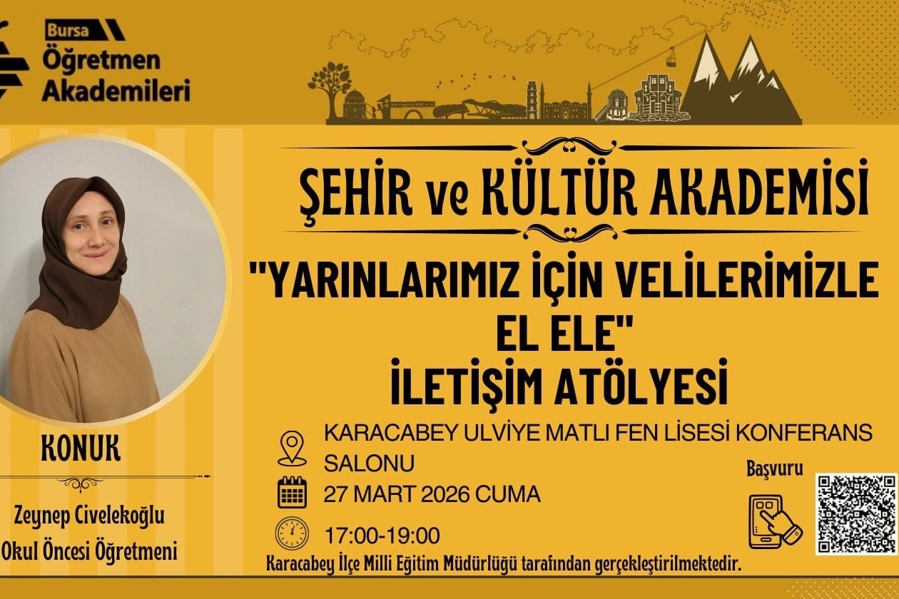 Şehir ve Kültür Akademisi kapsamında düzenlenen "Yarınlarımız İçin Velilerimizle El Ele" iletişim atölyesi, eğitim camiası ile velileri ortak bir paydada buluşturmaya hazırlanıyor. Karacabey İlçe Milli Eğitim Müdürlüğü koordinasyonunda gerçekleştirilecek olan etkinlikte, okul öncesi eğitim alanındaki deneyimiyle tanınan Zeynep Civelekoğlu konuk konuşmacı olarak yer alacak. Programın temel amacı; aile ve okul arasındaki iletişimi güçlendirerek çocukların geleceğine daha sağlam temellerle katkı sunmak olarak belirlendi.
