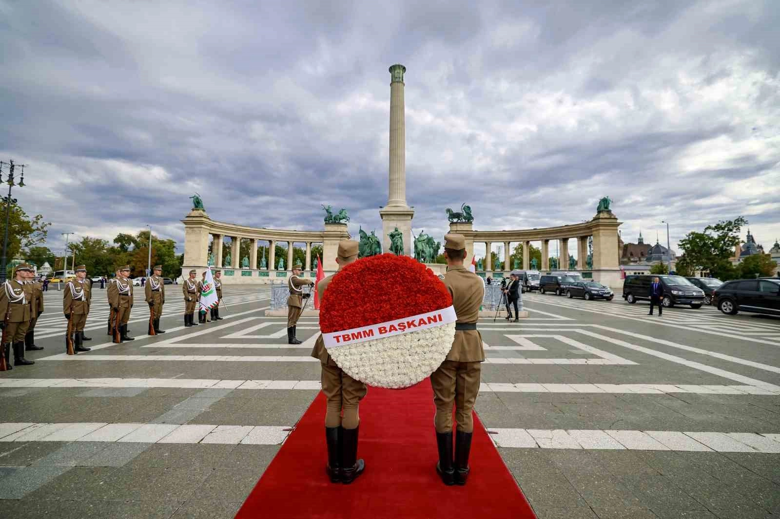 TBMM Başkanı Numan Kurtulmuş, resmi ziyaret düzenlediği Macaristan’ın başkenti Budapeşte’de temaslarını sürdürüyor. Numan Kurtulmuş temasları kapsamında, beraberindeki Türkiye-Macaristan Dostluk Grubu Başkanı AK Parti Eskişehir Milletvekili Fatih Dönmez, TBMM Katip Üyeleri AK Parti Mersin Milletvekili Havva Sibel Söylemez ve CHP Adana Milletvekili Müzeyyen Şevkin, TBMM İdare Amiri MHP Gaziantep Milletvekili Sermet Atay, Türkiye’nin Budapeşte Büyükelçisi Gülşen Karanis Ekşioğlu ile Kahramanlar Meydanı’na geldi. Macaristan-Türkiye Parlamentolar Arası Dostluk Grubu Başkanı Attila Tilki ile Macaristan’ın Ankara Büyükelçisi Viktor Matis tarafından askeri törenle karşılanan Kurtulmuş, daha sonra üzerinde "TBMM Başkanı" yazılı kırmızı beyaz karanfillerden oluşan çelengi anıta bıraktı.