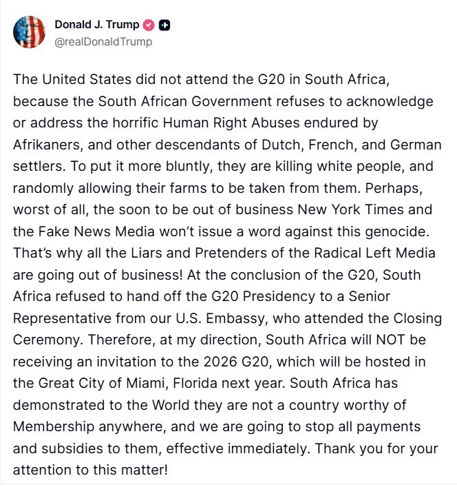 Güney Afrika’nın G20 Zirvesi’nin sonunda yapılan kapanış töreninde ABD Büyükelçiliği’nin kıdemli temsilcisine G20 dönem başkanlığını devretmeyi reddettiğini söyleyen Trump, "Bu nedenle Güney Afrika benim talimatımla gelecek yıl Florida’nın Miami kentinde düzenlenecek olan 2026 G20 Zirvesi’ne davet edilmeyecektir. Güney Afrika, hiçbir yerde üyeliğe layık bir ülke olmadığını dünyaya göstermiştir ve biz de kendilerine yapılan tüm ödemeleri ve yardımları derhal durduracağız" açıklamasında bulundu.