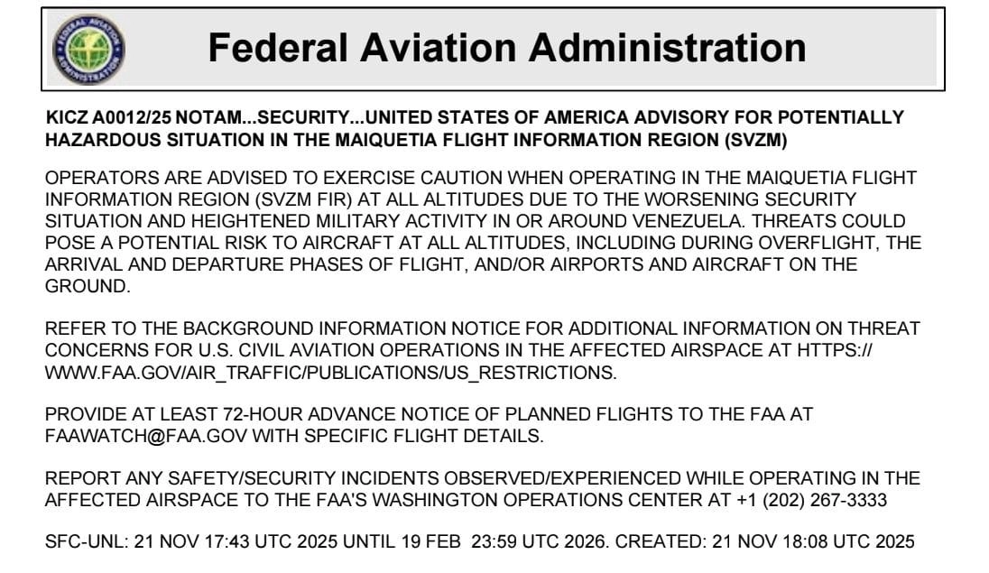 ABD ile Venezuela arasında yaşanan gerginlik gündemdeki tazeliğini korurken, ABD’den dikkat çeken bir hamle geldi. Bölgedeki tehditlerin geçiş, iniş ve kalkış safhaları ile havaalanı ve yerdekiler dahil tüm irtifadaki uçaklar için "potansiyel risk oluşturabileceği" vurgulanan açıklamada, bölgeye planlanan uçuşlar konusunda FAA’ya en az 72 saat önceden bilgi verme çağrısı yapıldı.