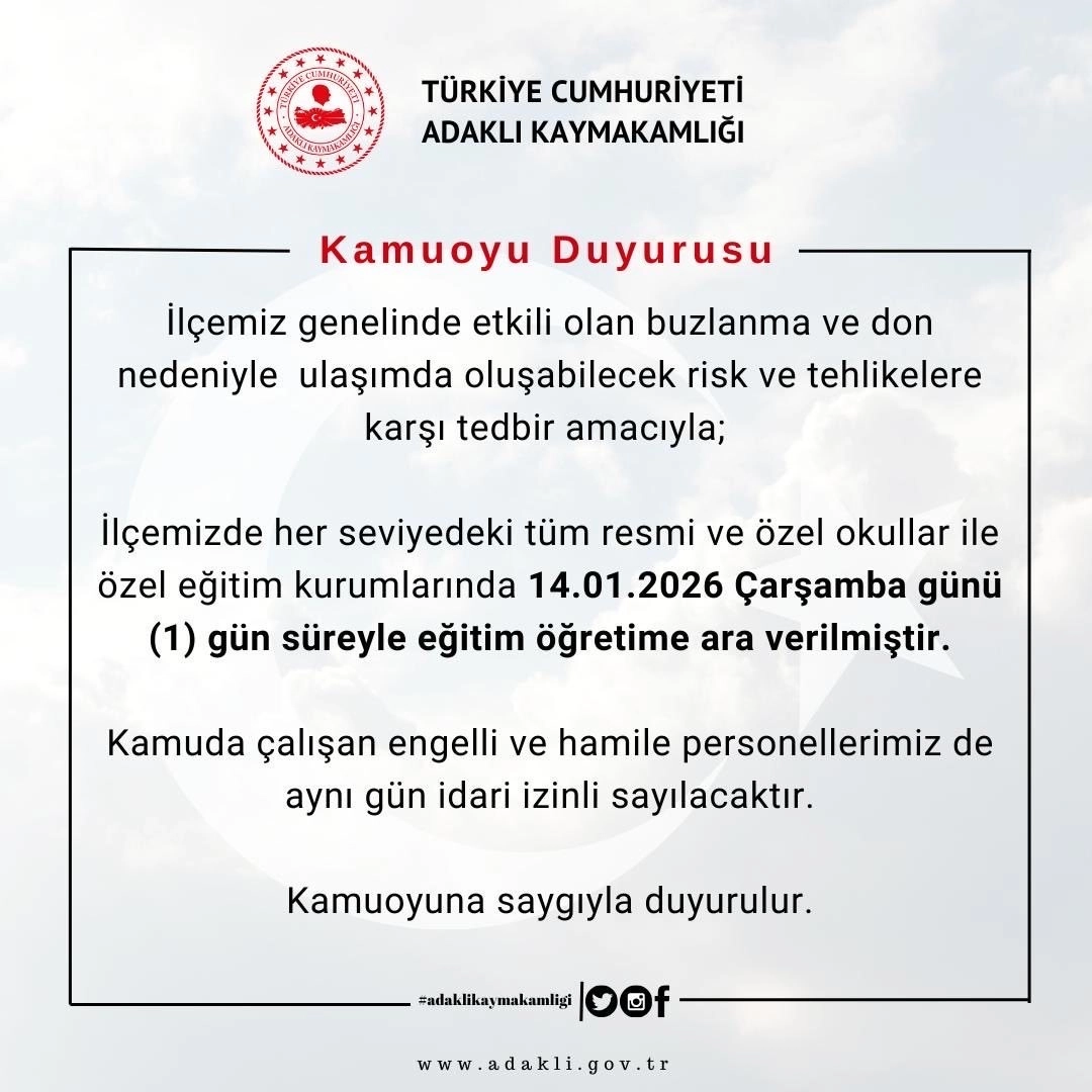 Bingöl’de kar yağışı etkisini sürdürüyor. Bu çerçevede Kiğı, Karlıova ve Adaklı kaymakamlıkları tarafından yapılan açıklamalarda, devam eden kar yağışı, buzlanma ve ulaşımda yaşanabilecek olumsuzluklar göz önünde bulundurularak, 14 Ocak 2026 Çarşamba günü ilçeler genelindeki resmi ve özel tüm eğitim kurumlarında eğitim ve öğretime 1 gün süreyle ara verildiği duyuruldu.