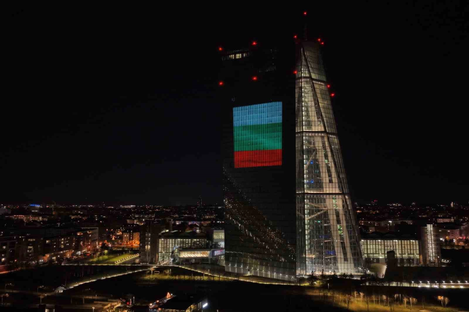 Avrupa Merkez Bankası’nın Frankfurt’taki ana binası da Bulgaristan’ın euro’ya geçişi nedeniyle Bulgaristan bayrağı ile ışıklandırıldı.