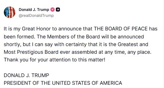 ABD Başkanı Donald Trump, Gazze Barış Kurulu’nun oluşturulduğunu ve 20 maddelik Gazze Barış Planı’nın bir sonraki aşamasına resmen geçildiğini belirterek, "Mısır, Türkiye ve Katar’ın desteğiyle tüm silahların teslim edilmesini ve her bir tünelin imha edilmesini içeren kapsamlı bir silahsızlanma anlaşmasını Hamas ile güvence altına alacağız" açıklamasında bulundu.