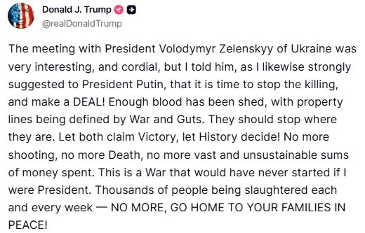 ABD Başkanı Donald Trump, kendisine ait Truth sosyal medya platformundan, Ukrayna Devlet Başkanı Vladimir Zelenskiy ile Beyaz Saray’da gerçekleştirdiği görüşme ile ilgili açıklamalarda bulundu. Zelenskiy ile görüşmesinin ilginç ve samimi geçtiğini belirten Trump, "Ancak ona, daha önce Başkan Putin’e güçlü biçimde söylediğim gibi, artık öldürmeye son verme ve bir anlaşma yapma zamanının geldiğini söyledim" dedi. Savaş ve cesaret ile çizilen sınırlar uğruna yeterince kan döküldüğünü vurgulayan Trump, "Bulundukları yerde durmalılar. Her iki taraf da zafer ilan etsin, kararı tarihe bırakalım!" ifadelerini kullandı. Artık ateş açılmaması, ölümlerin olmaması ve savaş için büyük ve sürdürülemez miktarlarda para harcanmaması gerektiğinin altını çizen Trump, "Bu, eğer ben başkan olsaydım asla başlamayacak bir savaştı. Her hafta binlerce insan katlediliyor. Artık yeter. Barış içinde ailelerinizin yanına dönün" çağrısında bulundu.